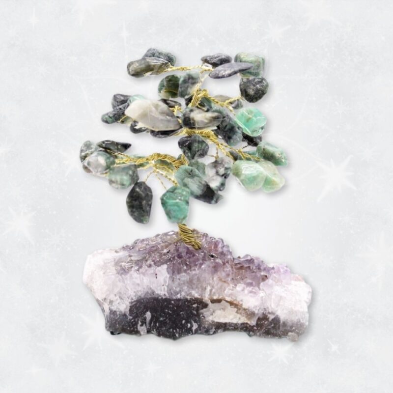 - Energia da Esmeralda: A esmeralda é conhecida pela sua energia revitalizante, associada ao crescimento, renovação e prosperidade. Cada pedra incorporada nos ramos desta árvore é um símbolo de vitalidade e equilíbrio, infundindo o seu espaço com uma energia verdejante e rejuvenescedora.